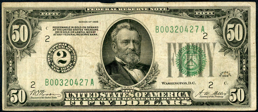 United States 50 Dollars 1928 (P 423). Federal Reserve New York, Gold bearing issue. Edge fold, a few old folds and some paper tone.