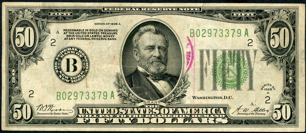 United States 50 Dollars 1928A (P 423a). Gold bearing issue. Part purple duty stamp, a few old folds and pencil notations on back.
