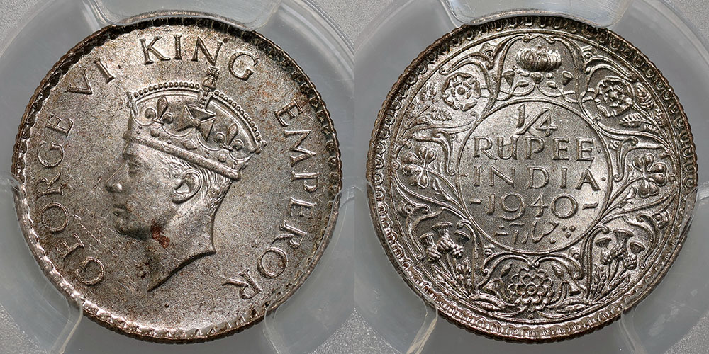 India Quarter Rupee 1940B. PCGS graded MS 63 (32897764). Short trefoils. Bright bloom.