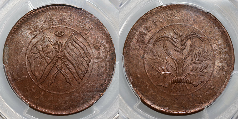 China Hunan Province copper 20 Cash N/D (1919). PCGS graded MS 61 BN (87389622). Brown lustre.