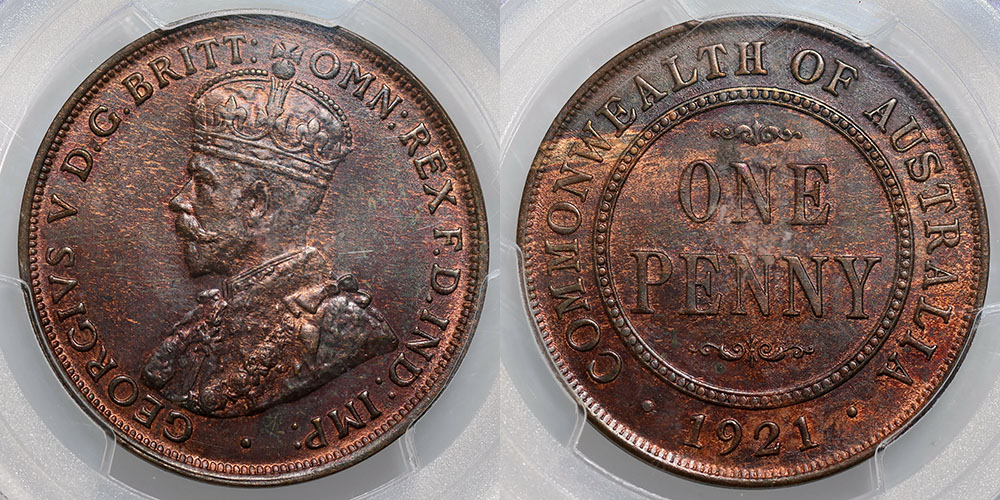 1921. PCGS graded MS 63 RB (26779556). Dark brown with hints of red.