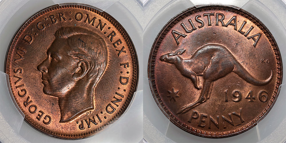 | Description: 1946. Key date. PCGS graded MS 64 RB (45593900). Mint red and brown lustre with nice eye appeal. Only three graded higher and rare in this grade. Ch.UNC/GEM |