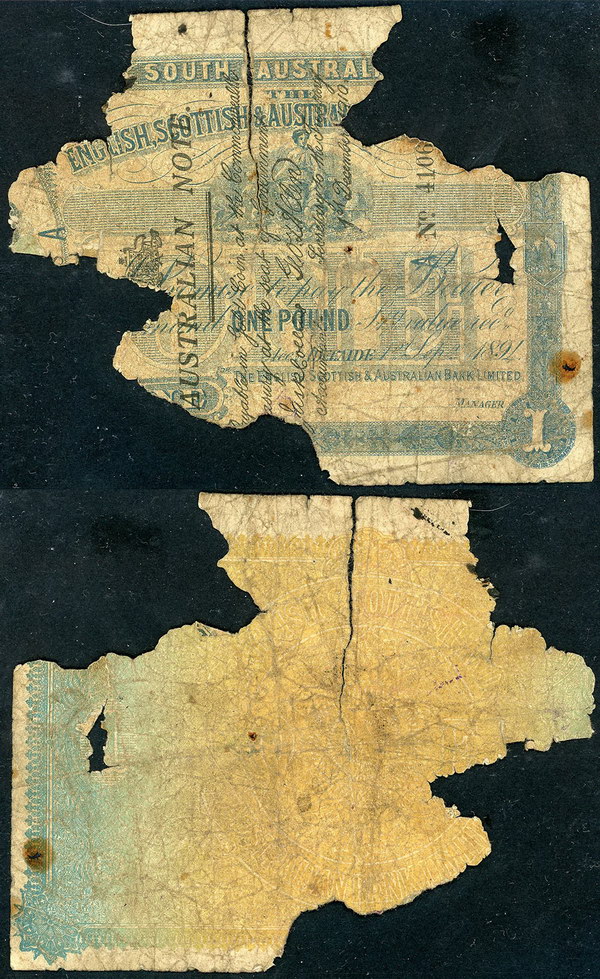 | Description: 1914 Collins-Allen Emergency Issue (R 19). Emergency superscribed Type II on an English, Scottish and American Bank 1 Pound 1894. Fragment only, with approximately 40% of note missing in patches but most of superscribed area intact. Tattered with holes, pinholes, rust and tears, but very rare in any grade with less than 20 known. Ex I.S Wright with tag. POOR |