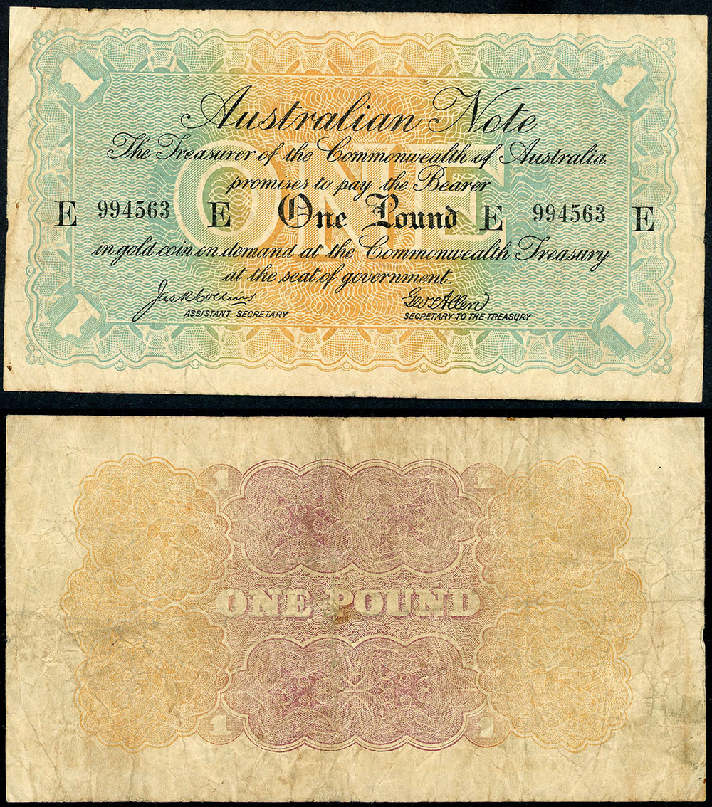 | Description: 1914 Emergency Issue Collins-Allen Rainbow Pound (R 20bF). No omitted, First prefix and suffix E-E. Old folds and creases, but with good colour for this issue, and an ideal type note of this rare emergency issue. FINE |