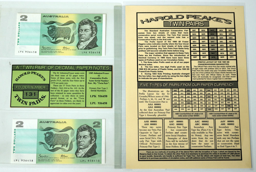 | Description: 1985 Johnston-Fraser (R 89). Consecutive prefix matching serial pair; LPK/LPL 936458. In Harold Peake unofficial collector Twin Pairs album. UNC |