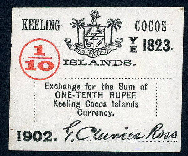 Cocos Keeling Islands 1/10th Rupee 1902 (P S124). Printed on card, G. Clunies-Ross. Ink smudge on back.