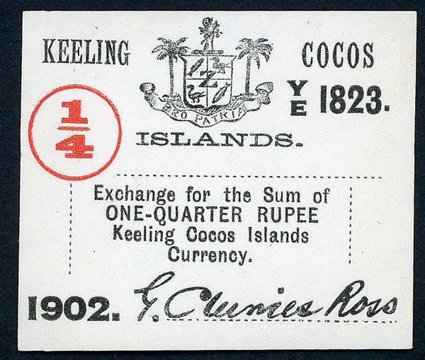 Cocos Keeling Islands Quarter Rupee 1902 (P S124). Printed on card, G. Clunies-Ross.