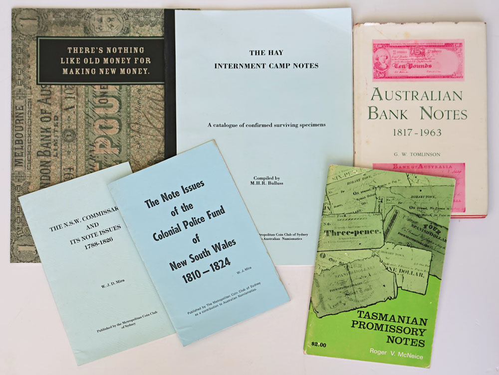 | Description: Australian Banknotes 1817-1963 hardcover book by G.W. Tomlinson (some damage to cover), booklets The NSW Commissariat and its Note Issues 1788-1826 and The Note Issues of the Colonial Police Fund of NSW 1810-1824 by Metropolitan Coin Club Sydney, Tasmanian Promissory Notes softcover book by Roger McNeice, The Hay Internment Camp Notes catalogue by M. Bulluss and old John Pettit catalogue c2008. (5 items total). USED |