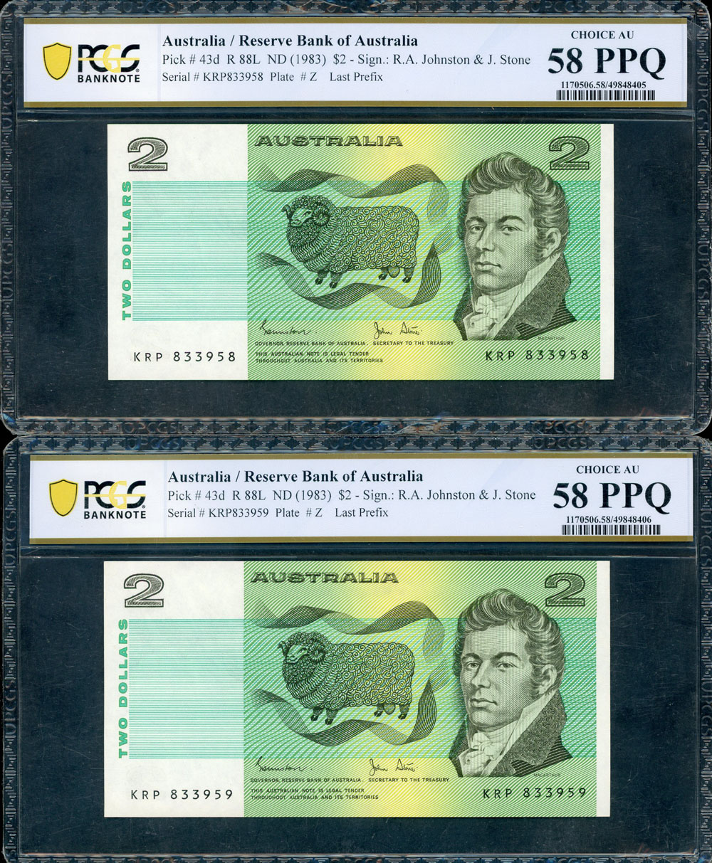 1983 Johnston-Stone KRP (R 88L). Last Signature prefixes. Both PCGS graded Choice AU 58 PPQ (49848405/6). Consecutive pair.