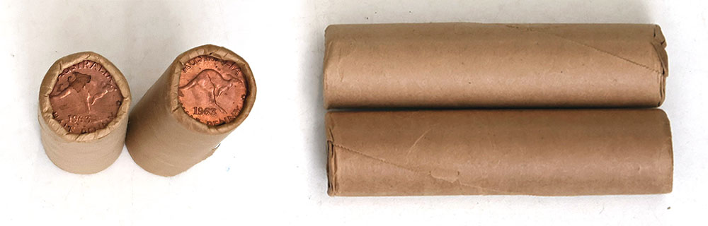 1963Y. Plain brown paper (bank) rolls of 40. End coins a little toned as usual. Assumed Unc. (2 rolls total).