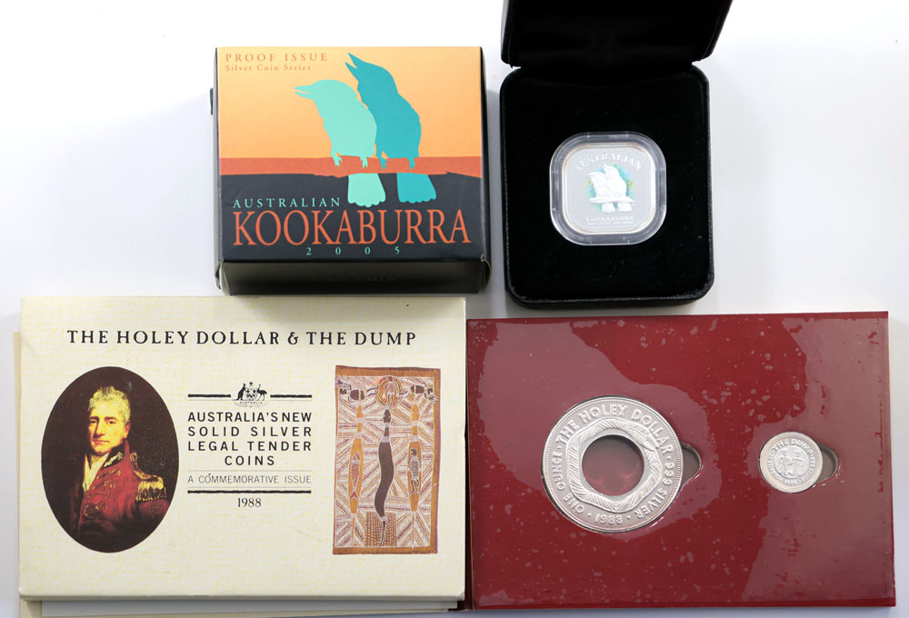| Description: 2005 Australian Kookaburra coloured silver Proof 1/2 oz. With case, COA and box (case sticky). Also 1988 Holey Dollar and Dump silver 2-coin set. (2 items total). FDC |
