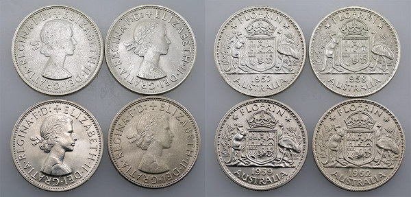 Florin. 1957, 1958 (scratch), 1959. Light tone...