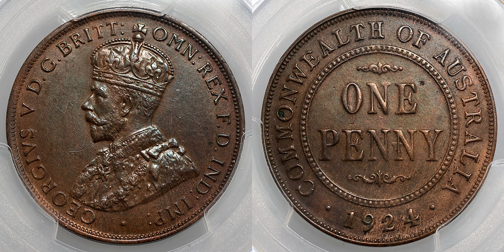 1924. English Obverse. PCGS graded MS 62 BN (82945988). Mostly brown lustre.