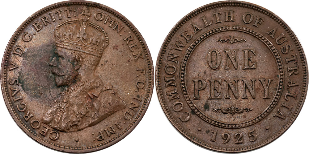 1925. Key date. Brown, almost full band. Minor Obverse planchet flaw and some darker tone.