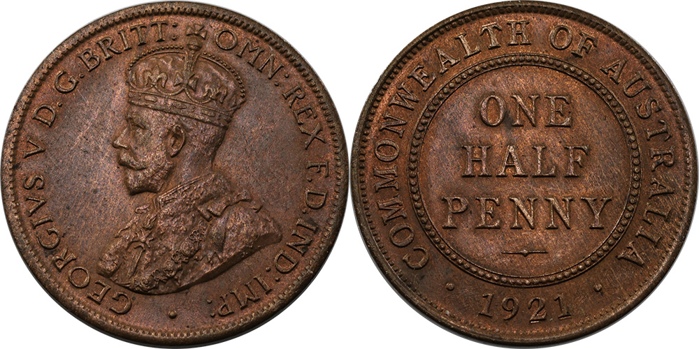 Halfpenny. 1923. Key date. Brown with six...