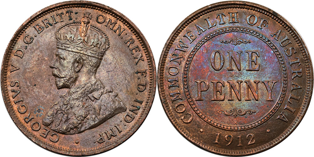 1912H. Brown and red with iridescent lustre, minor planchet flaw through crown.
