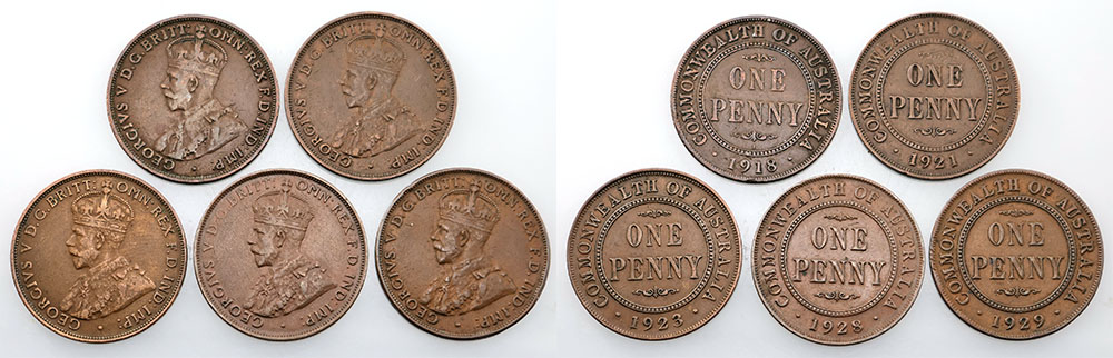 1918I, 1921, 1923, 1928, 1929. Brown. (5 coins total).