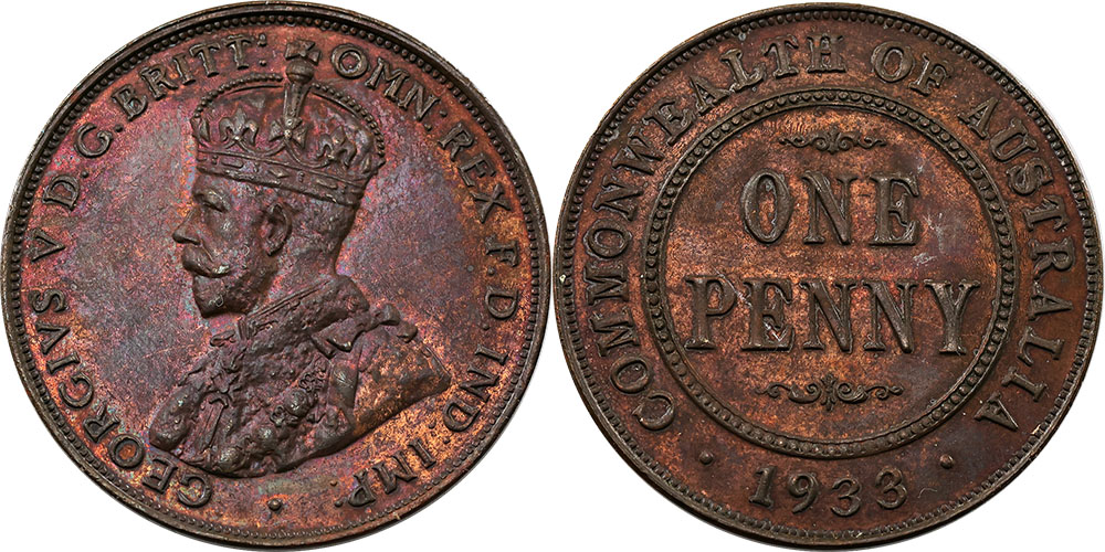 Penny. 1934. Brown and some red lustre.