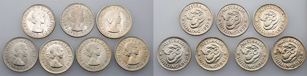 1957, 1958, 1959, 1960, 1961, 1962, 1963. Light tone. (7 coins total).