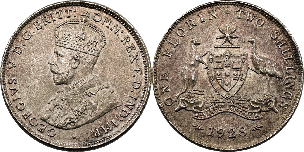 Florin. 1928. Light tone with some bloom.