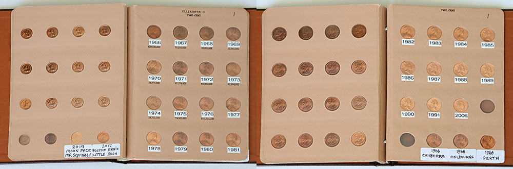 | Description: 1 and 2 Cent collection 1966-2006, complete. Also includes a few extras including 1966 1 Cent and 2 Cent Canberra, Melbourne and Perth varieties. Mostly red, likely from RAM sets. In Dansco porthole album. (61 coins total). UNC-Ch.UNC |