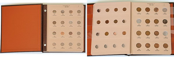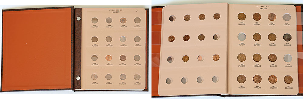 | Description: 1 and 2 Cent collection 1966-1991, incomplete. Missing 1972, 1985, 1986, 1991 1 Cent and 1969, 1970, 1977, 1986, 1987, 1990, 1991 2 Cent. Some red Unc but many circulated. In Dansco porthole album. (42 coins total). FINE-UNC |