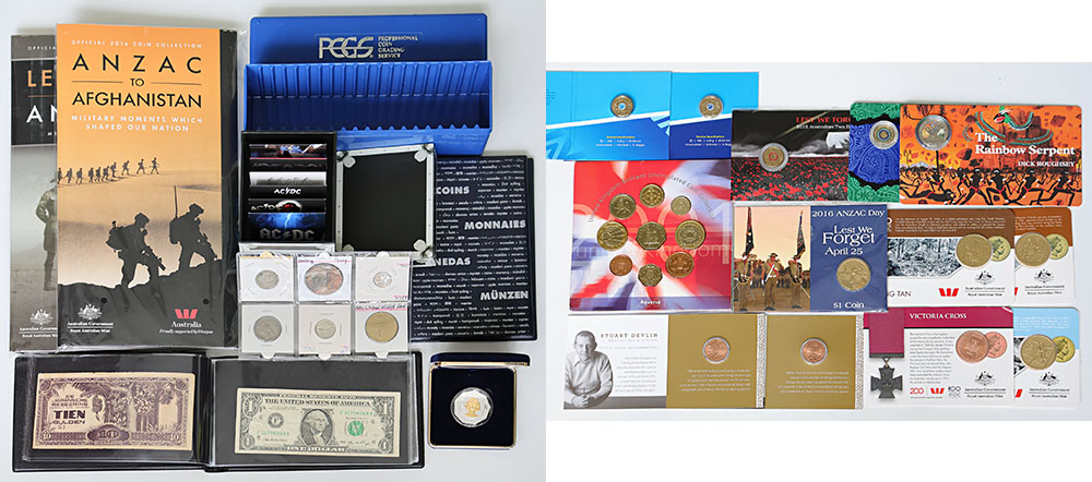 | Description: 2 Dollar 2025 Australian Open coloured in packs (2), 2025C Torres Strait on card, 2015 Lest We Forget (Downies pack), 1 Dollar 2016 Anzac Day (Pert Mint pack), 20 Cent AC/DC 2023 Vol 2 6-coin set in box, 2025 The Rainbow Serpent coloured on card, Anzac 2016, 2017 20/25 Cent collections in folders plus extra 4 issues on cards and 2 Cent Stuart Devlin on cards (2). Also includes: Threepence 1964 Unc, Sixpence 1962, NZ Shilling 1952, USA 5 Cent 1917, R Parker Geelong Penny token, Cleland tourist token, Hutt River Province 2013 Princess Shirley commemorative bi-metal 10 Dollar (cased), UK 2001 Unc mint 9-coin set, small album of 10 Japan JIM notes and USA 1 Dollar bill, small empty coin album and plastic PCGS storage box. (27 items total). FINE-UNC |