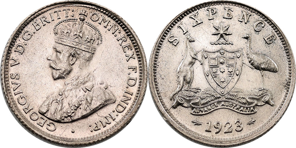 1923. Double struck with slight doubling on rims, die cracks and line along kangaroos back, once dipped.