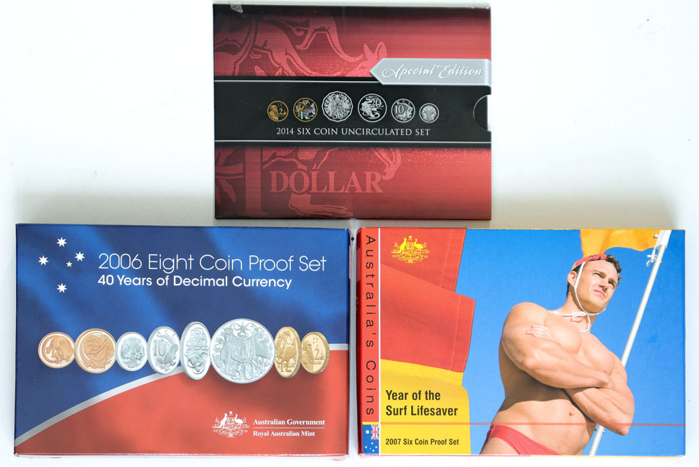 2006, 2007 Proof sets. Also 2014 Mint set with coloured Dollar. In packs of issue. (3 items total).