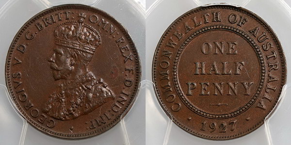 Halfpenny. 1923. Key date. Brown, four pearls.