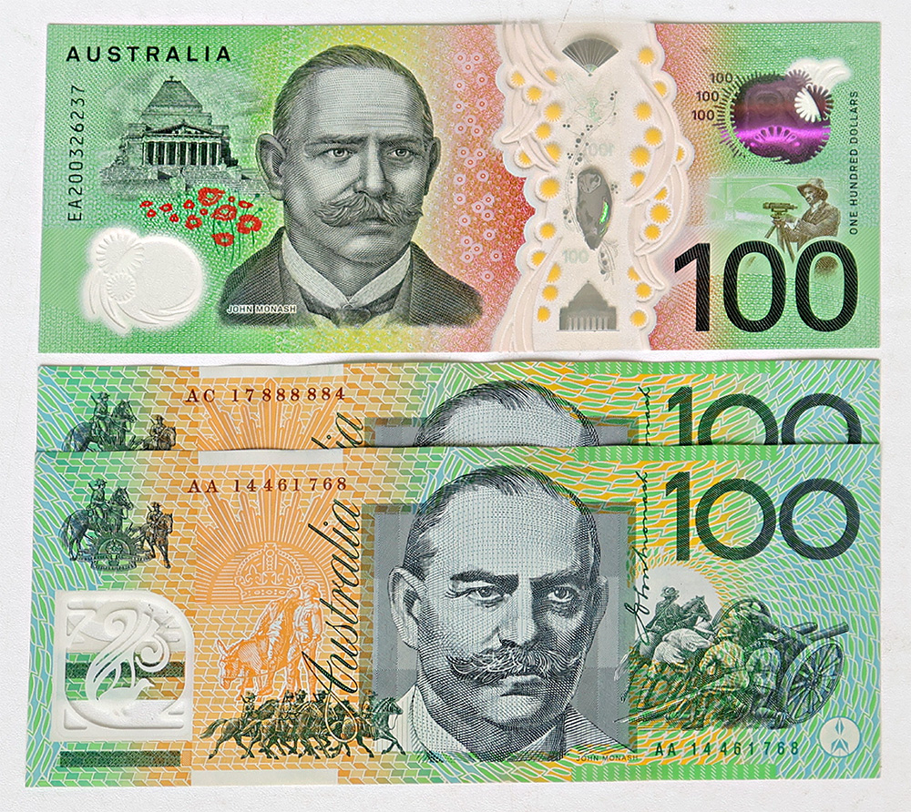 | Description: 2014 polymer Stevens-Parkinson AA 14 (R 622b) a little wavy, 2017 Lowe-Fraser (R 625) almost-solid serials 888884 (centre fold) and 2020 Lowe-Kennedy EA 20 (R 628aL) Last Sig prefix. (3 notes total). gEF-UNC |