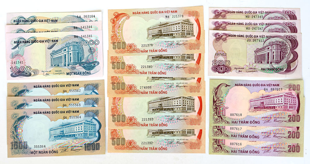 | Description: Vietnam South 200 Dong 1970 (P 27a) (3), 200 Dong 1972 (P 32a) trio, 500 Dong 1972 (P 33a) pair and 3 singles, 1000 Dong 1971 (P 29a) (3) and 1000 Dong 1972 (P 34a) trio. (17 notes total). EF-UNC |