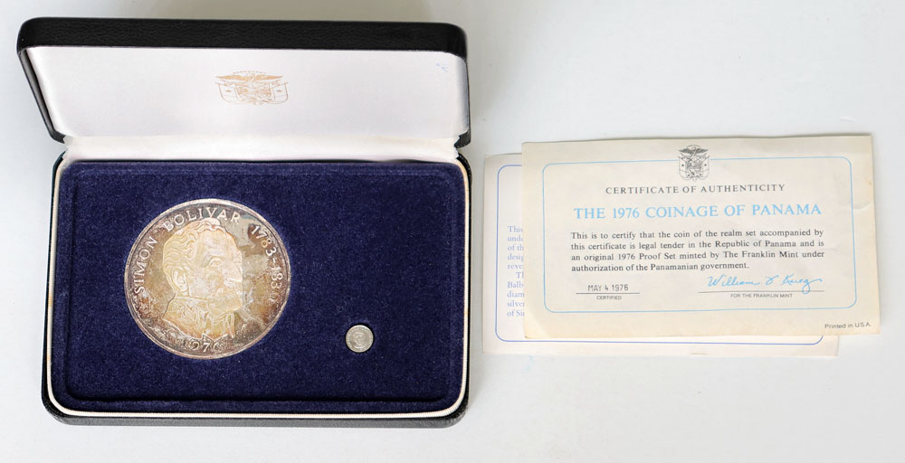| Description: Panama largest and smallest 2-coin Proof set. Includes silver 20 Balboa (61mm/129.6g) and 2.5 centesimo (10mm). Toned. In case of issue by Franklin Mint. FDC |