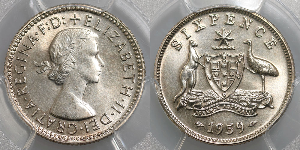 1959 Proof Sixpence. PCGS graded PR 65 (27466712). Light hint of tone.