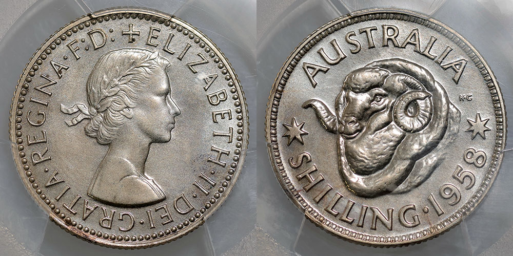 1958 Proof Shilling. PCGS graded PR 65 (41697086). Light tone.
