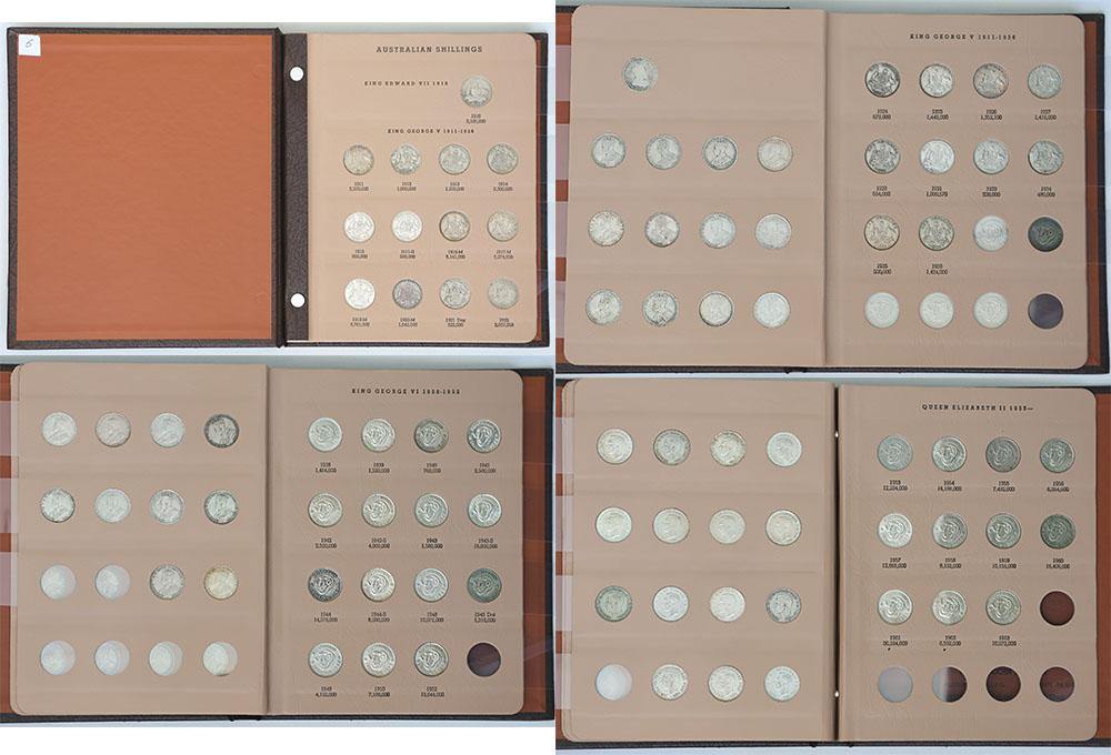 | Description: Shilling set 1910-1963, complete. An overall decent set, with key date 1921 star and 1933 in G/VG, some better later dates. In Dansco porthole album. (49 coins total). GOOD-UNC |