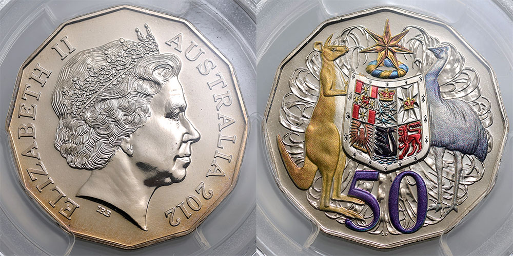 2012 Coat of Arms colourised. PCGS graded MS 66 (30891485). Slight Obverse tone.