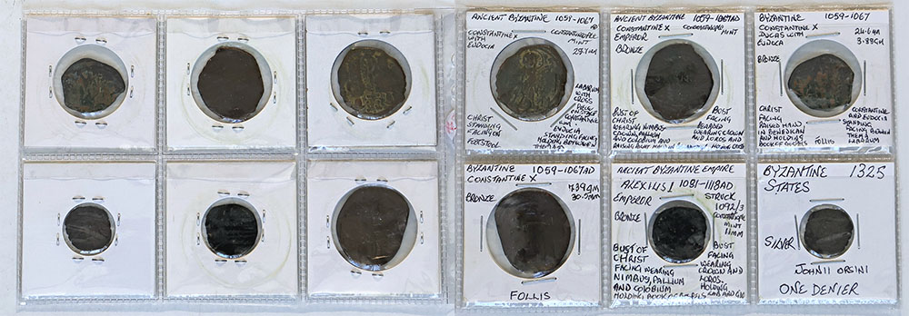 | Description: Ancient Byzantine Empire Constantine X copper Follis (approx 28mm, 1059-1067 AD) (4), Alexius I copper minor (11mm, 1081-1118 AD) and John II Orsini copper Denier (17mm, 1325 AD). (6 coins total). POOR-FINE |
