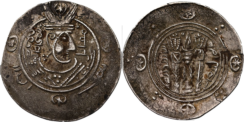 | Description: Ancient Sassanian Kingdom silver Half Drachm Abbasid Governors of Tabaristan 22mm (756-793 AD). Obv: Bust of King right in style of Khusru II, Rev: fire altar with two attendants. Toned. gVF |