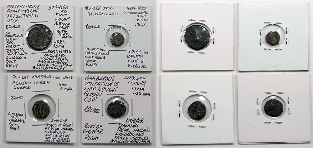 | Description: Ancient Roman Imperial bronze minors Valentian II (17mm, 379-383 AD) and Theodosius II (11mm, 408-450 AD). Also Ancient Vandals pseudo-Imperial coinage bronze minor (14mm, 440-490 AD) and counterfeit late 4th Century Roman bronze minor (13mm). (4 coins total). GOOD-VG |