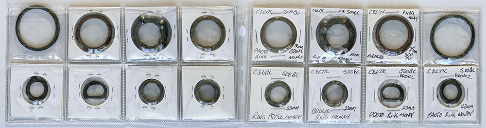 | Description: Ancient Celtic proto-money (c500-100 BC); bronze small thick 23mm (4), large thick 34-35mm (3) and large thick knobbly 35mm. Celtic ring money dates from approximately 800 to 50 BC, when these sturdy gold, silver, bronze and lead rings were traded as currency among the Celtic tribes from the Danube River region to Eastern Europe, France and Spain. And later, sometimes Britain, Wales, Scotland and Ireland. Scarce. (8 items total). G-VG |