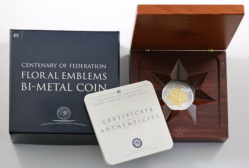 2001 Centenary of Federation Floral Emblems silver and gold bi-metal Proof. In box of issue with COA.