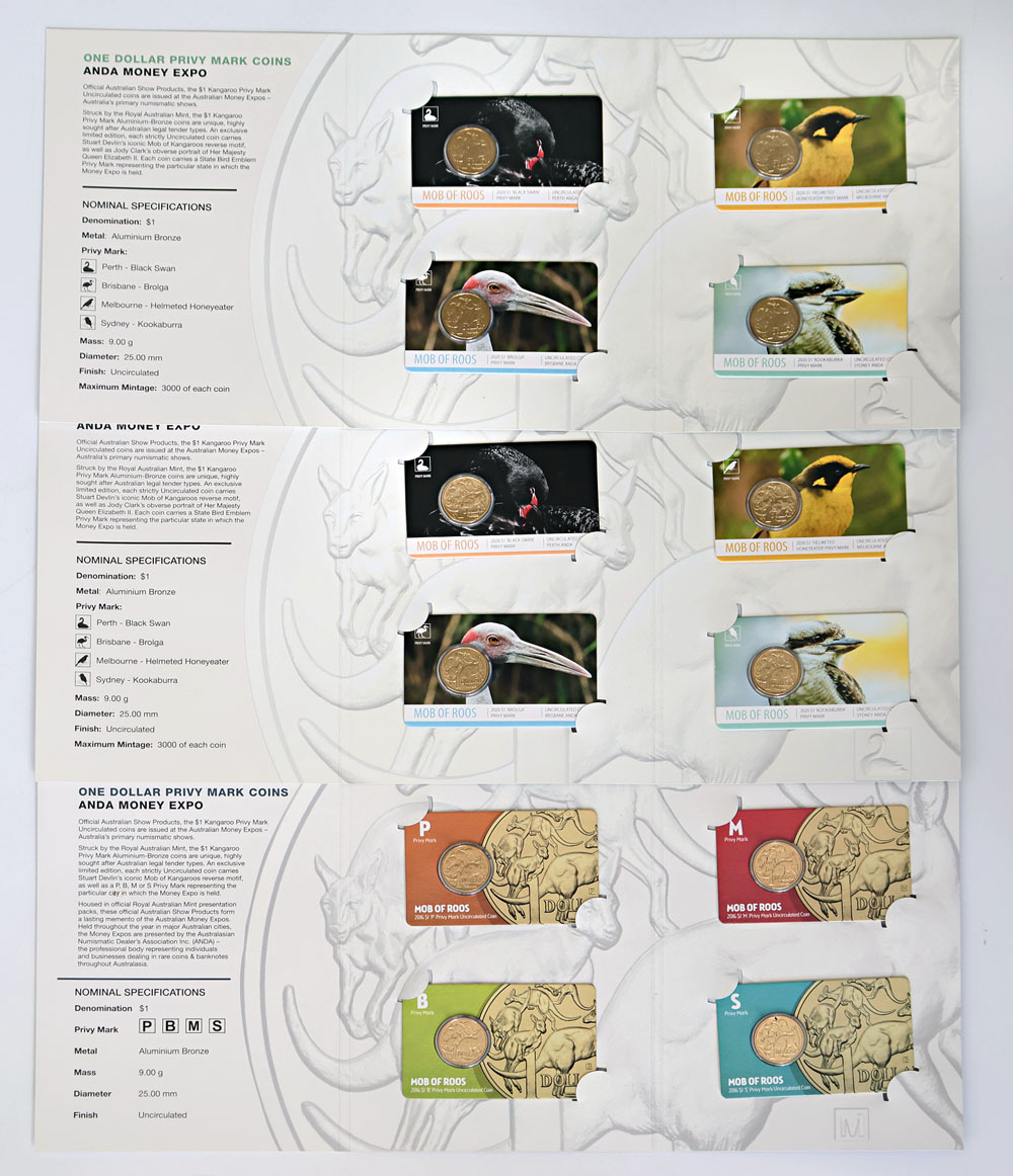 2016, 2020 (2) ANDA set of 4 B, M, P, S privy mark Dollars on cards in ANDA folders. (3 items total).
