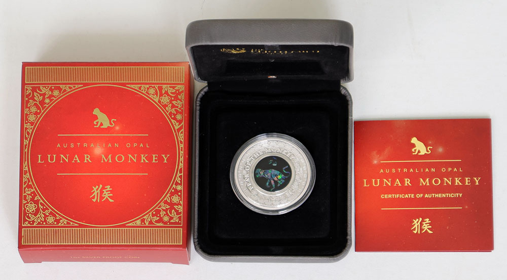 2016 Australian Opal Lunar Monkey 1 oz silver Proof. In box of issue with COA (light not working). A popular issue.