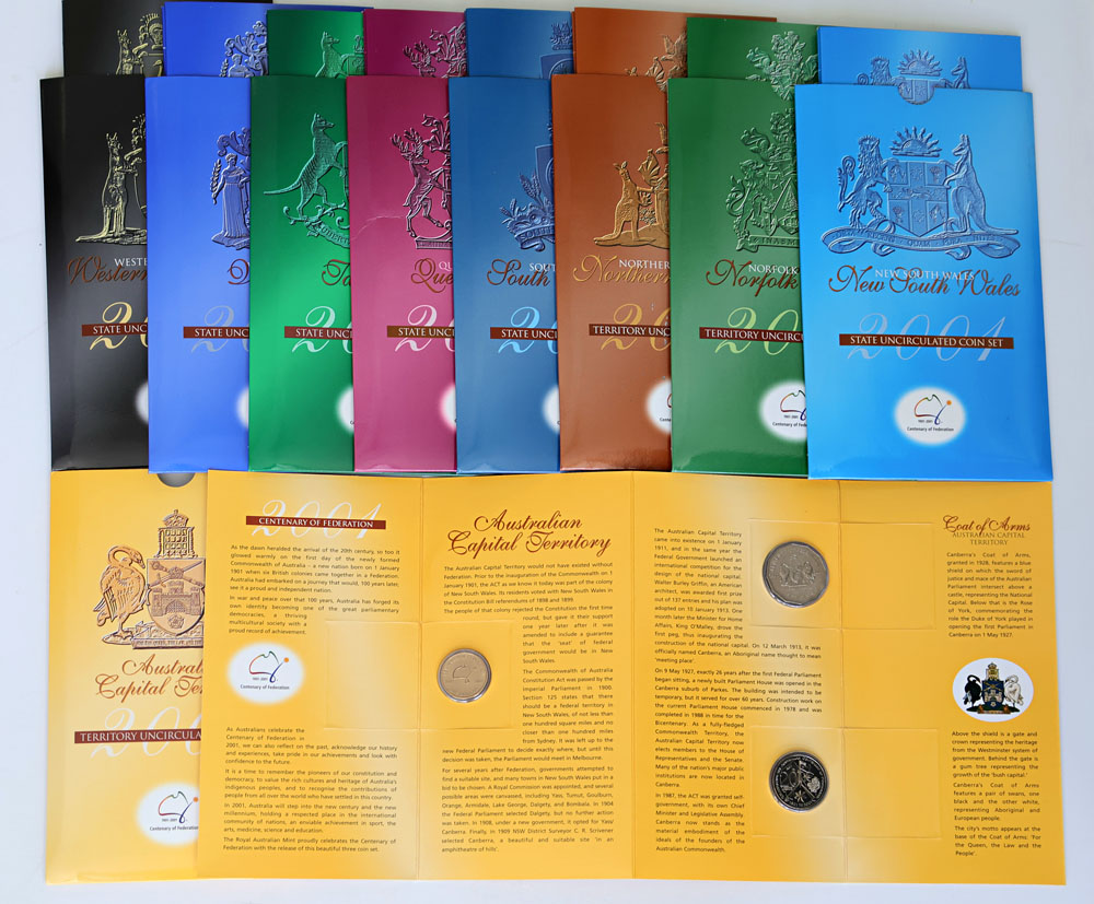 | Description: 2001 Centenary of Federation State Series 20 Cent, 50 Cent and 1 Dollar 3-coin Unc sets: ACT (2), NSW, Norfolk Island, NT, QLD (2), SA, TAS (2), VIC, WA. In folders of issue. (12 items total). FDC |