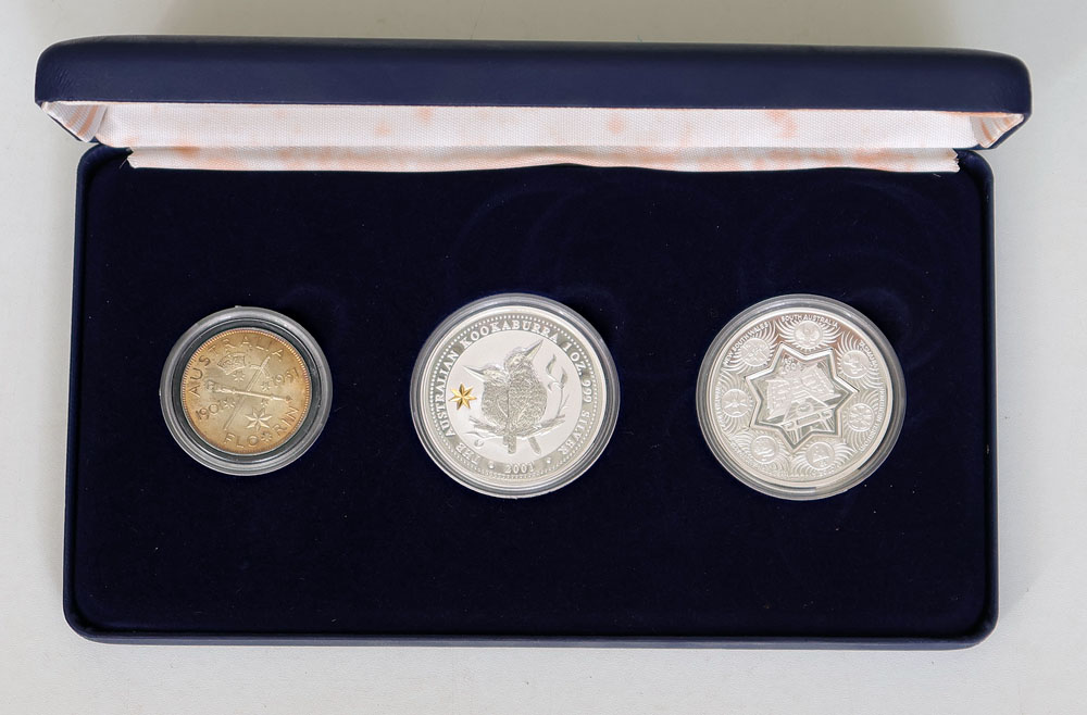 | Description: 2001 Federation Star Collection 3-coin set of 1951 Jubilee Florin, 2001 1 oz silver Proof Kookaburra star privy and 2001 COF Holey Dollar and Dump style 1 oz silver Proof. In single case of issue with COA (environmental damage and marks to case, Florin toned). UNC-FDC |