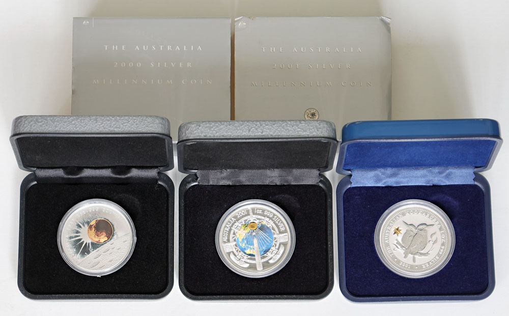 | Description: 2000 Millennium Earth, Moon and Sun coloured, 2001 Millennium Cleopatras Needle coloured and 2001 Centenary of Federation silver Kookaburra with star privy 1 oz silver Proof issues. In cases of issue (some damage to covers, last missing slipcover. (3 items total). FDC |