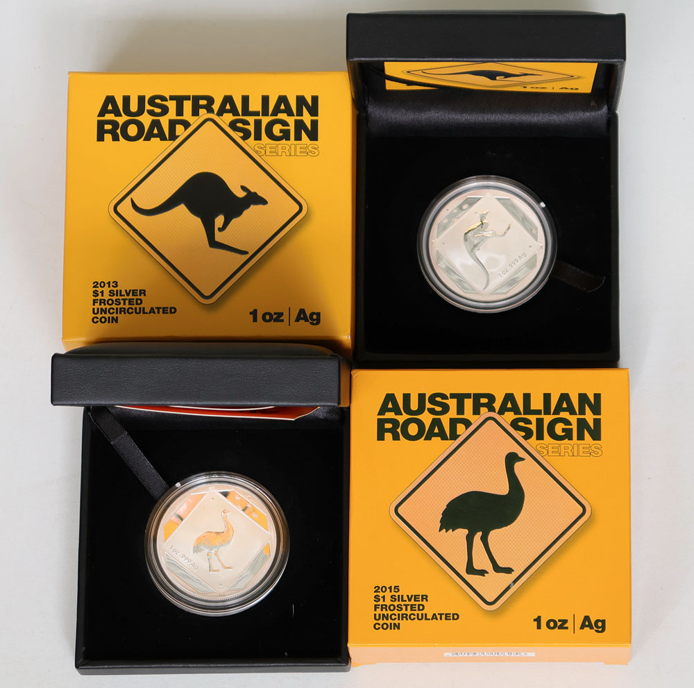 2013, 2015 Australian Road Signs Kangaroo and Emu 1 oz silver frosted Unc issues. In boxes of issue with COA. (2 items total).