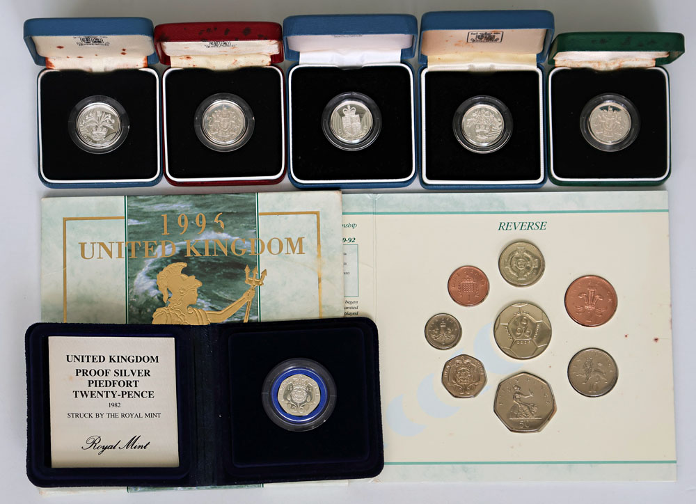 | Description: Great Britain 1 Pound silver Proof 1983, 1984, 1987, 1988, 1 Pound silver piedfort Proof 1983, 25 Pence silver Piedfort Proof 1982 and 1996 Celebration of Football 8-coin Unc set by Royal Mint. In cases of issue, some storage marks and tone. (7 items total). UNC-FDC |