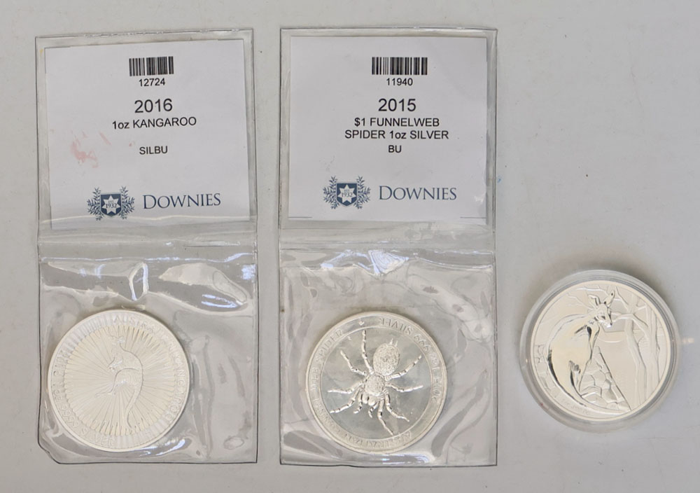 | Description: 2015 Funnel-Web Spider, 2016 Australian Kangaroo, 2022 Australian Kangaroo $1 1 oz silver Unc issues. In capsules. (3 coins total). UNC |